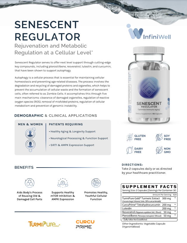 Senescent Regulator serves to offer next level support through cutting-edge key compounds, including pterostilbene, resveratrol, luteolin, and curcumin, that have been shown to support autophagy.